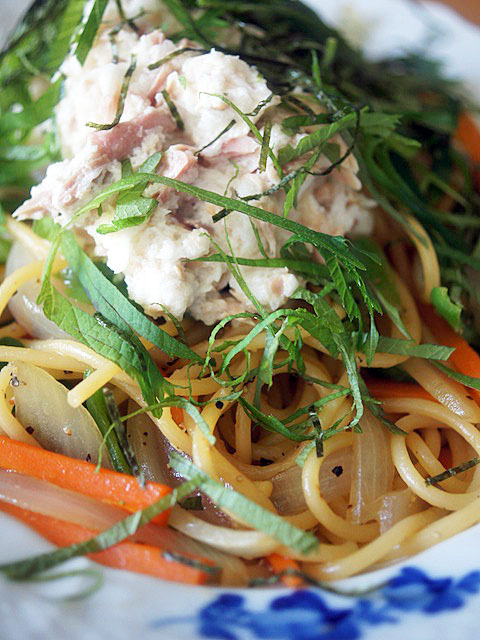 茹でたパスタを具材とあわせてジャジャッと炒め醤油で風味を付けたらお皿に盛って、ツナ大根と大葉、それから海苔をちらした。