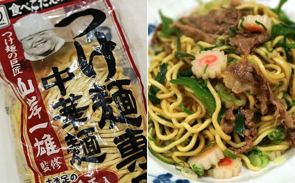 ひさしぶりに焼きそば作ってみたくって、焼きそば用の袋麺を買おうと思ってスーパーにいき、大勝軒のプロデュースしたつけ麺用の麺をみつけて、この太麺で焼きそば作ったらどうなるんだろう…、って、それでためしてみることにした。