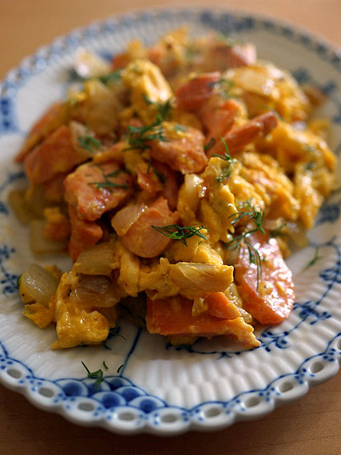 スモークサーモンのほどよき切り身が手に入り、それを使って玉子を焼きます。