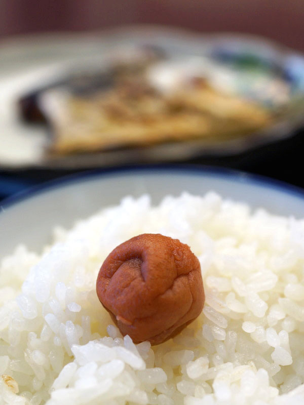 ご飯の上に梅干しをおき、パクっと食べて朝のお腹をめざました。