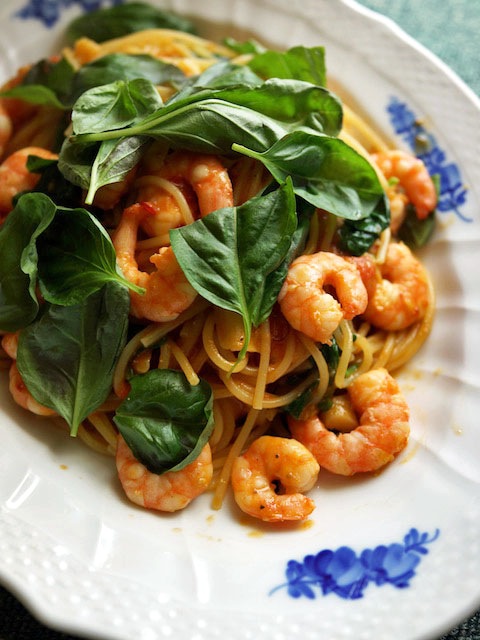 エビを戻してパスタをくわえ、バジルを入れてザザッと混ぜる。