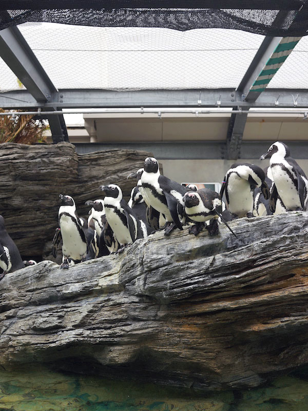 大きな岩場の上にぎっしり並んで水槽を見下ろしながら、飛び込もうか、飛び込むまいかと首を出したり引っ込めたり。その滑稽な様にニッコリ。