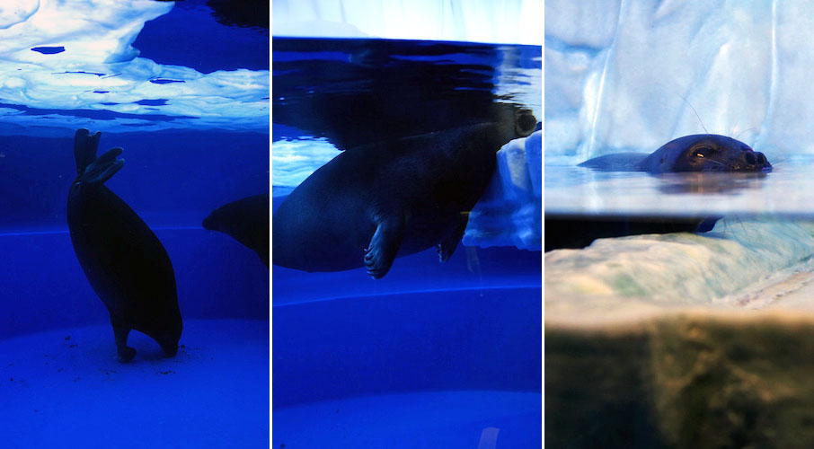 氷河の下で過ごす姿を見れるよう、趣向を凝らした水槽の中でゆっくり泳ぐあざらしも、やっぱりどこかのどかに見える。