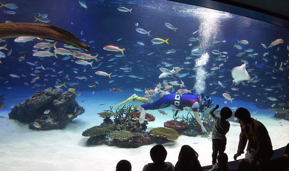 アクリル精製の技術がよくなり、驚くほどの巨大水槽が次々、登場する中で、さすがにビルの中だからその大きさには限界がある。