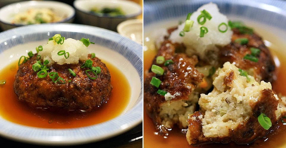 豆腐に山芋、中にはひじきが入っててハンバーグ状にまとめられてはいるけれど、まさにそれはガンモドキ…、表面カラッと揚がってて風味豊かに香ばしい。