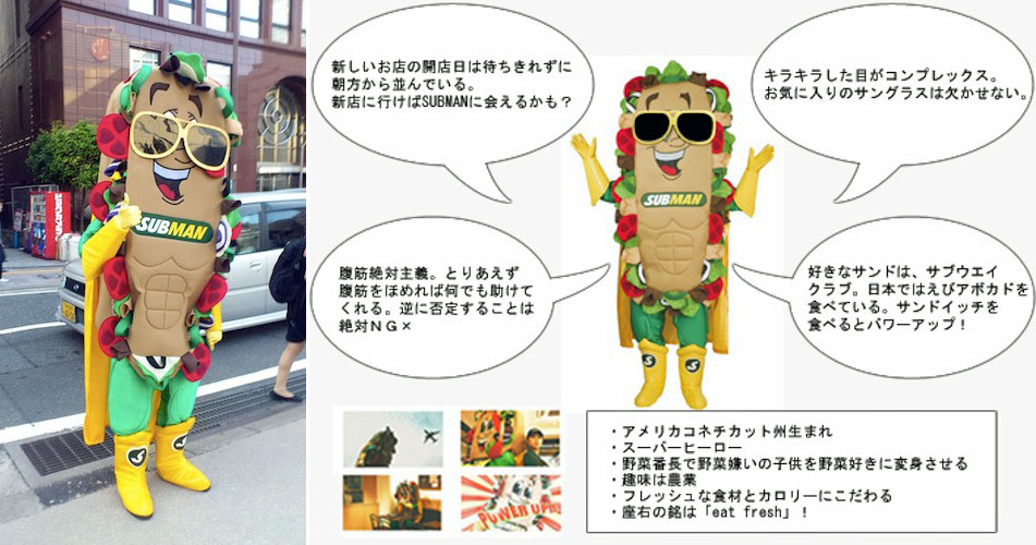 このスポンジボブみたいな造形のキャラクター…、アメリカのサブウェイでずっと前から活躍している「サブマン」っていう公式キャラクターなんだって。