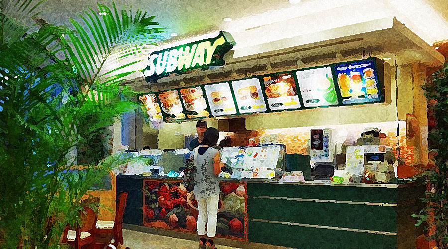 一方、サブウェイ側は女性が中心、背筋伸ばしてニコニコしながらサンドイッチを頬張っている。
