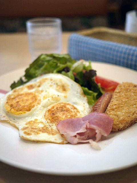 ここではずっとスクランブルエッグをたのんでたのだけど、今日は思い直して目玉焼き。