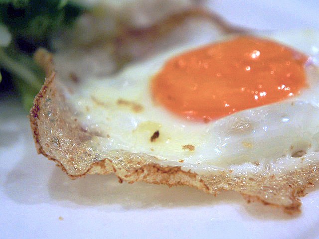 白身の縁がチリチリ、茶色いレースのように焼き上がっていて、けれど黄身の中はトロトロ。