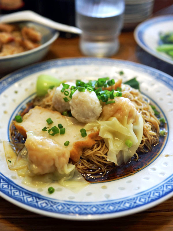 香港の麺の具材の代表的なモノばかりにて、プルプルとした雲呑と、フックラとしたすり身の食感がバッサリとした麺の食感ひきたておいしい。