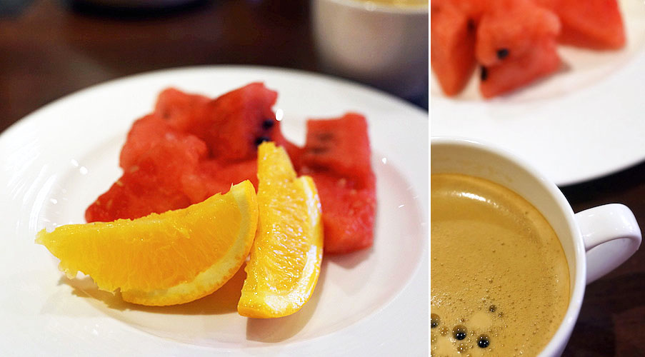 スイカがとてもおいしげで、それでスイカをタップリ山盛り。オレンジ添えてお腹の中を潤し食べる。