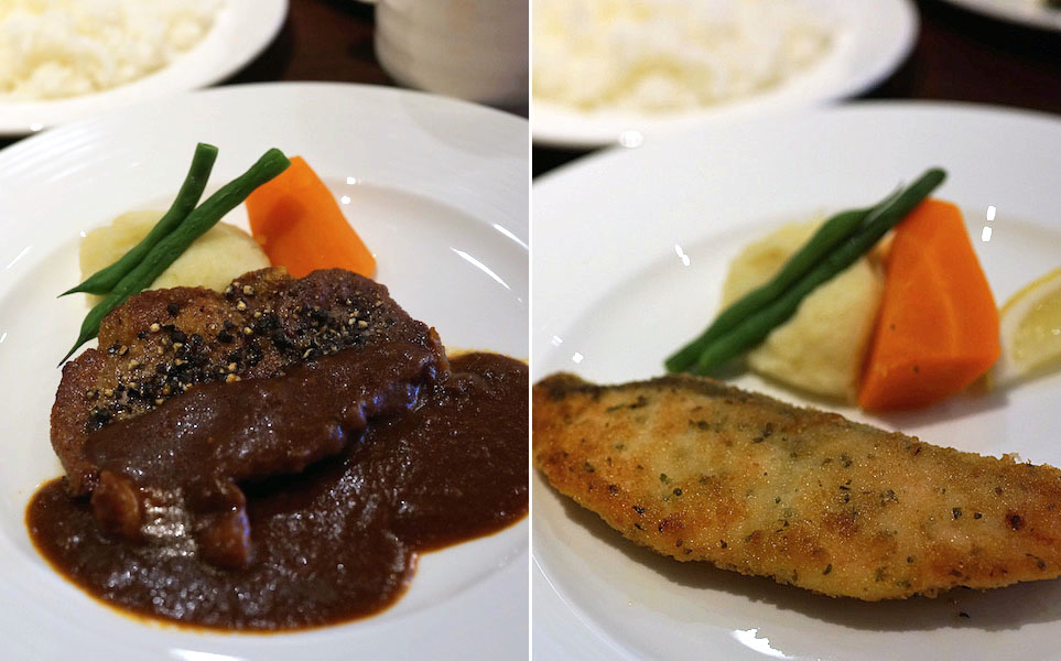 メインディッシュをつけることにして、ポークロースのペッパーステーキとサーモングリル。