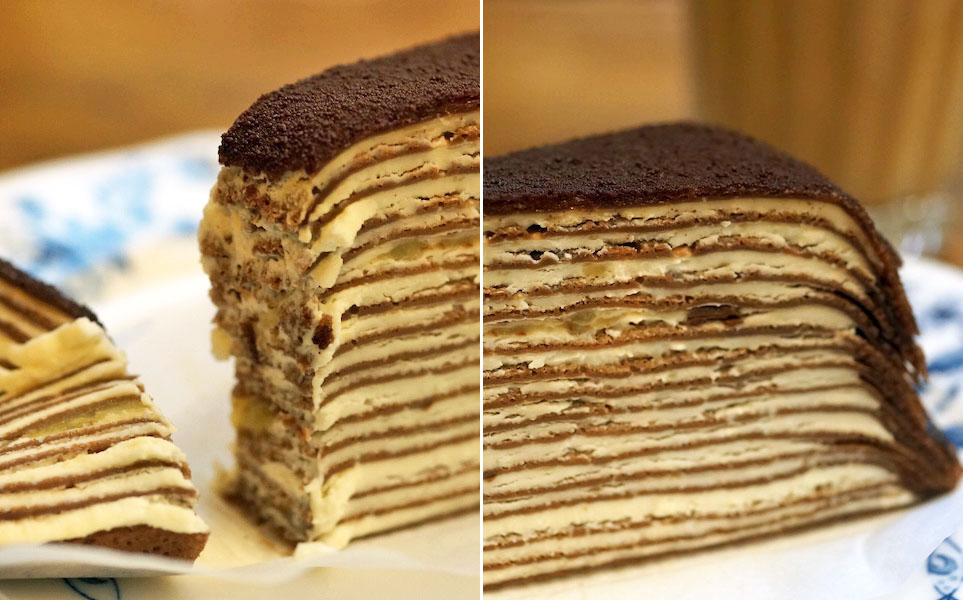 クレープ1枚、チョコを塗り、クリーム塗ってクレープ1枚。それを何度も繰り返しケーキの形にして切り、食べる。