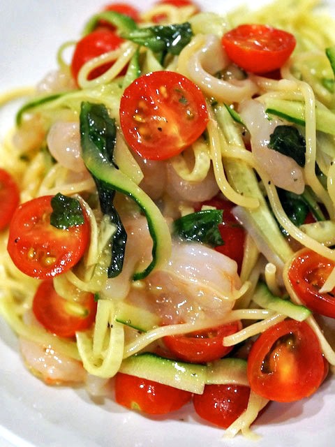 キュウリを千切りにしたものを茹でて冷やして〆たパスタと一緒に具材と一緒に合わせ、オリーブオイルと塩と胡椒をかけまわしつつ、グイグイ揉んで、味をすべてになじませる。