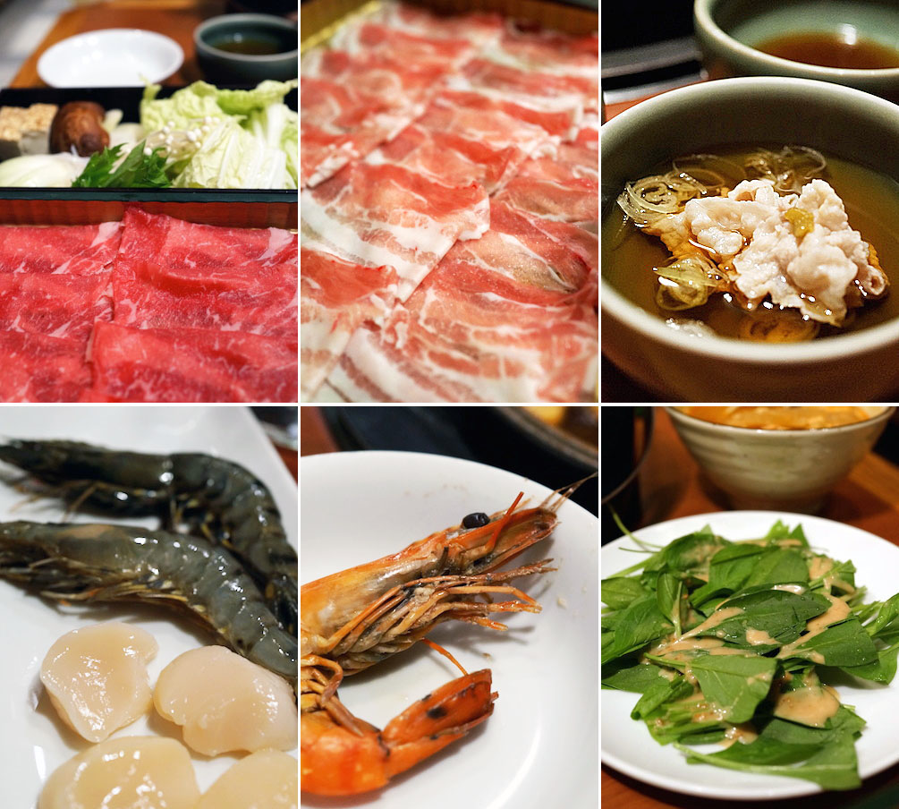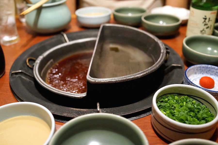 すき焼き用の浅い鍋。しゃぶしゃぶ用の深い鍋。それを半分こにして真ん中でピタッとくっつけた独特の構造の鍋がオモシロく、これをたのむと、割り下に水、しゃぶしゃぶ用の出汁にゴマだれ、ポン酢に薬味。豚しゃぶ用のそばツユがそれぞれ器に入ってテーブルをニギヤカにするのがまずオモシロイ。