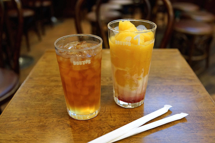 フローズンマンゴーなるシャーベットドリンクと、甘夏とはちみつ加えたルイボスティー。どちらも夏の季節の商品。
