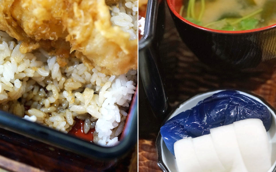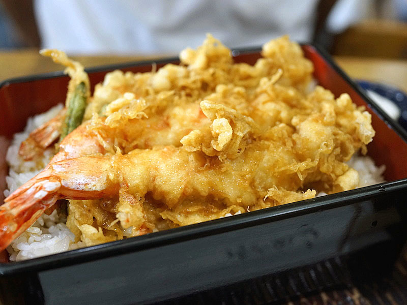 丼でなくお重に入ってやってくる。立派に太った海老が三本。胡麻の油の匂いがズッシリ。ちょっと重ための香りが旨い。