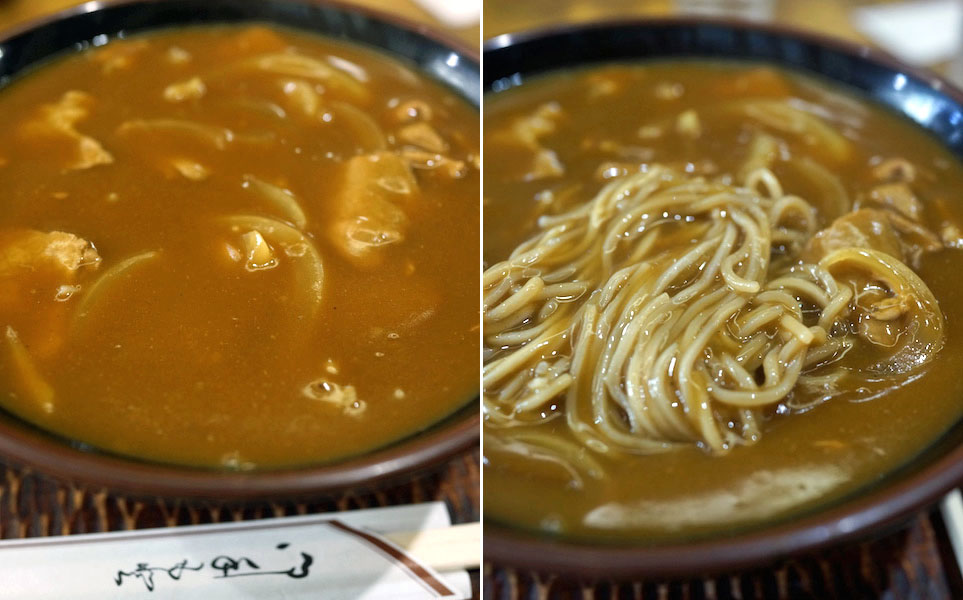 ポッテリとしたカレースープがすべてを覆ってツヤツヤしてる。箸を突っ込み探ると下にはギッシリ蕎麦。カレースープと一緒になって箸に重たく、ズッシリまとまり持ち上がる。