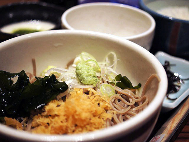 ネギにワカメに天かすに、それにわさびが乗っかっている。