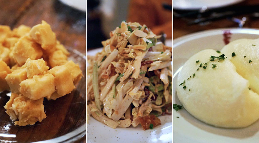 ナチュラルチーズの味噌漬けは、ネットリとした食感に味がワインのお供にピッタリで、蒸して割いた鶏胸肉と、セロリや生の白菜をピーナツバターとワインヴィネガーと一緒にあえたカリフォルニア風のアジアンサラダ。