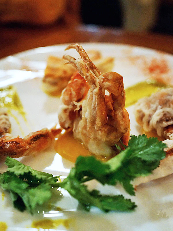 カラッと揚がった脱皮直後の丸ごとのカニ。殻の部分はサクッと歯切れて、中はクチュッとみずみずしい。肉はフワフワ、味噌や卵がトロトロで口いっぱいにカニの旨みが広がるおいしさ。
