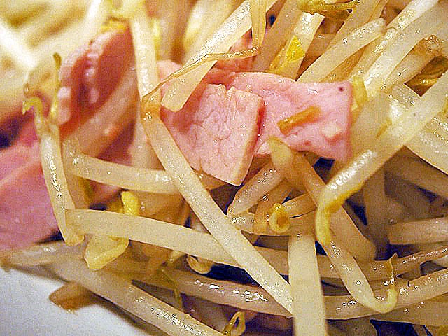 ラーメンだけだと栄養バランスが崩れそうにて、モヤシとハムを塩で炒めてそれをおかずにズルンと食べた…、過食に過食を重ねてしまう、オバカさんな夜のコト。