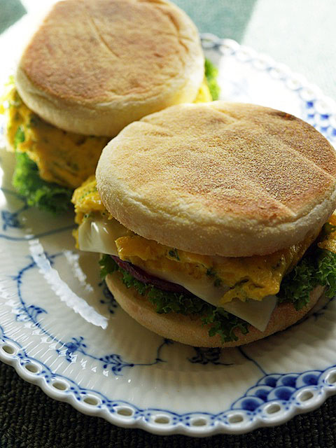 マフィンの上と下側を逆に挟んでしまいましたです…、天地がひっくり返ったマフィンサンドになっちゃいました、それも良し。
