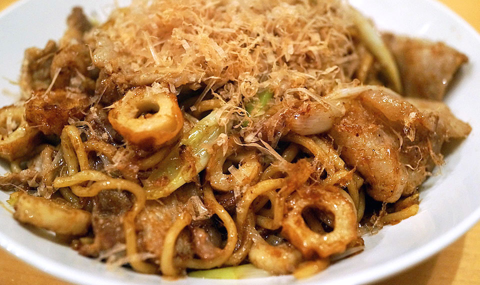 豚バラ肉をこんがり焼いて、蒸し麺投入。塩と胡椒と出汁を注いで蓋して蒸らす。