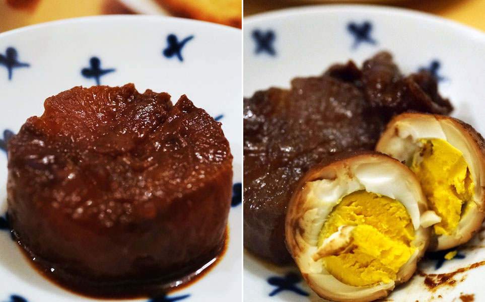 牛すじ肉をネギと一緒にじっくり炊いて、スープをとる。別のお鍋で大根をたき出汁と一緒に牛すじスープと合わせてそこに厚揚げ、こんにゃく、茹で卵。