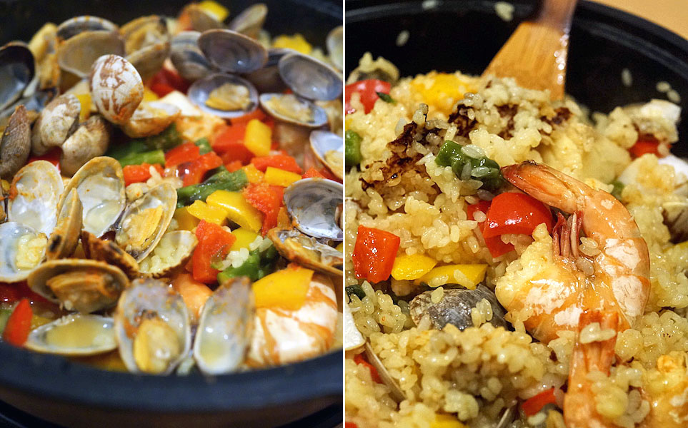 フォンにサフランをあわせて味のベースを作り、ホットプレートに生米そのまま。スープを流して上に具材をドッサリと置く。