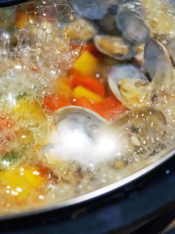 具材はパプリカ、真鱈にエビにアサリをタップリ。ディルを刻んでくわえた芥子マヨネーズやレモンをしぼってハフハフ食べる。