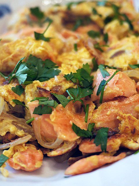 ソテしたタマネギの甘い香りと、スモークサーモンの脂の風味が玉子をとてもおいしくさせる。