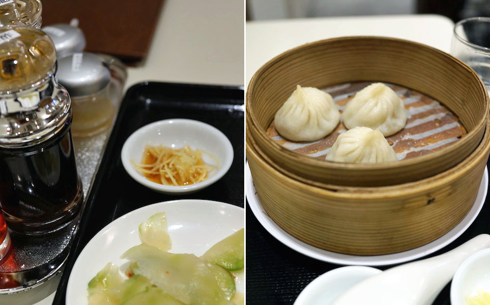テーブルの脇には胡椒や醤油に混じって、黒酢、紅酢がおいてある。小さなお皿に千切りにした生姜がたっぷり。そこに紅酢を注いで小籠包にのっけてパクリ。