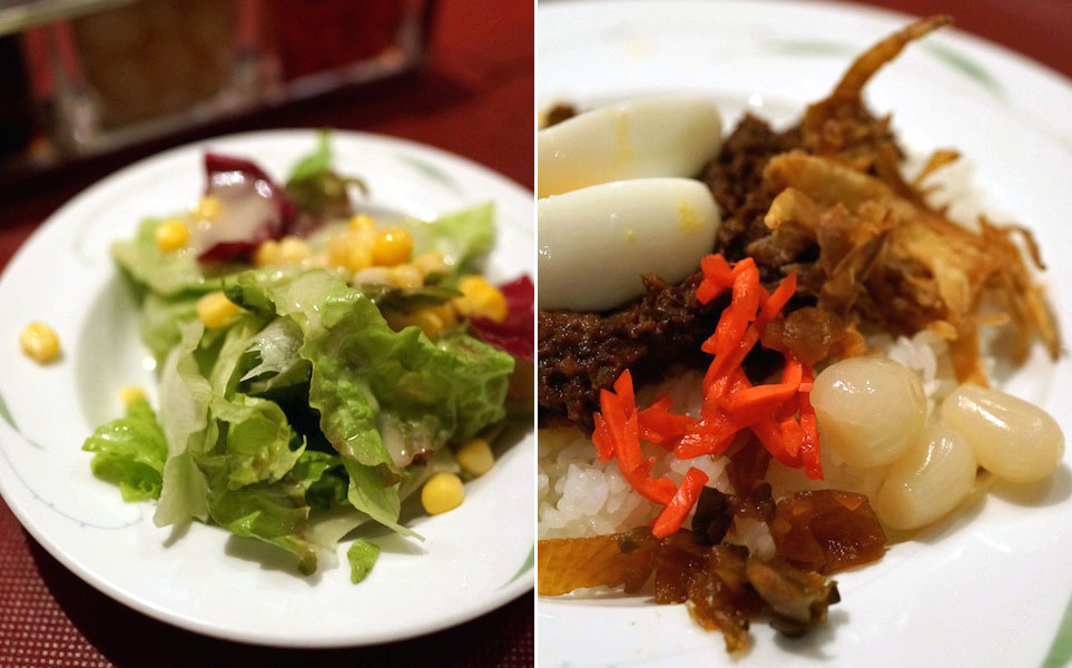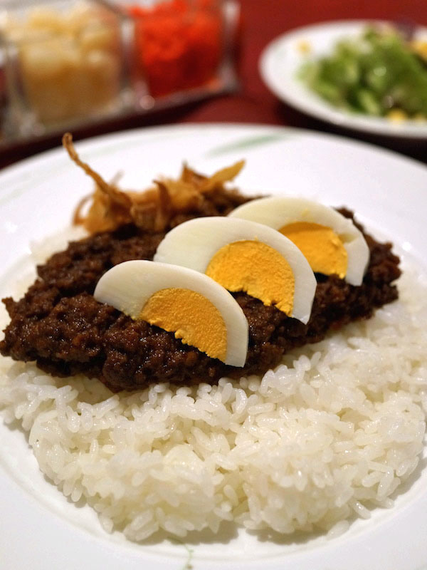 固めのご飯の上にカレー風味のひき肉がタップリのっかり、くし切りにした玉子が3個。みようによっては帆船の帆のようでもあり、うつくしい。