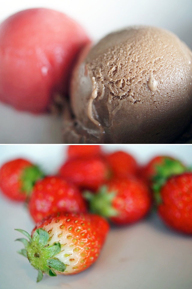 アイスクリームにイチゴをとってテーブルの真中あたりに置いてみんなで分けあい食べる。