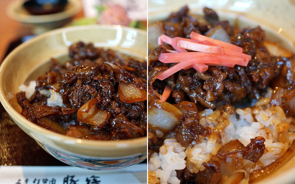 口が疲れる程のおいしさ…、ご飯がどんどんすすんでたのしく、別添された千切り紅しょうがを乗っけてワシっとかきこむと、なるほど牛丼…、オモシロイ。
