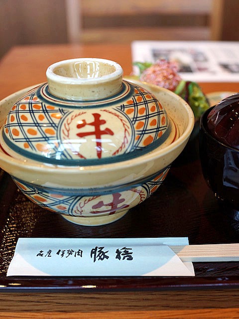 昼はすき焼きは提供せず、牛丼、あるいはステーキ丼がメインですよというコトで、牛丼選んでたのんで食べる…、ズッシリとした丼の蓋に「牛」の文字がめでたい。