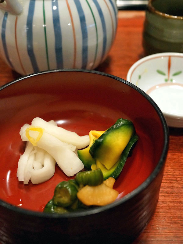 季節によって変わるところもたのしくて、今日はキュウリにゆず大根、瓜の浅漬が盛り合わされてた。