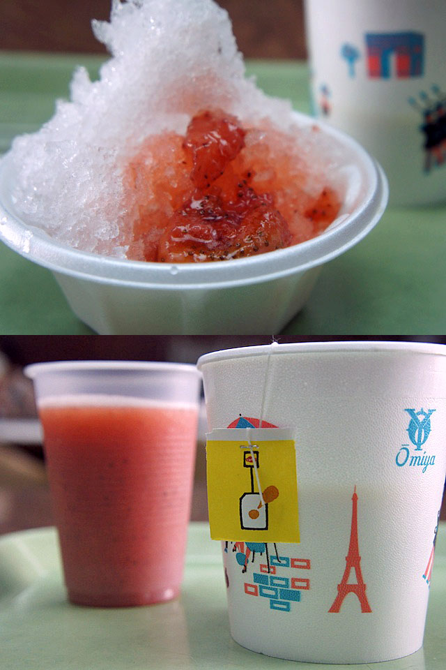 途中でイチゴのジュースをかけて、サラサラ飲んで体をブルッと冷たくさせる。