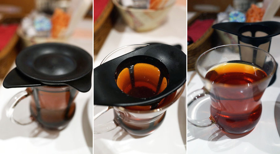 ガラスのマグにプラスティックの蓋に同じ素材のストレーナー。飲むときは蓋を外して裏返し、テーブルに置き、凹みにストレーナーを休ませる。好みの濃度でたのしめて、しかもテーブルを汚したりすることがないのがウレシイ仕組み。