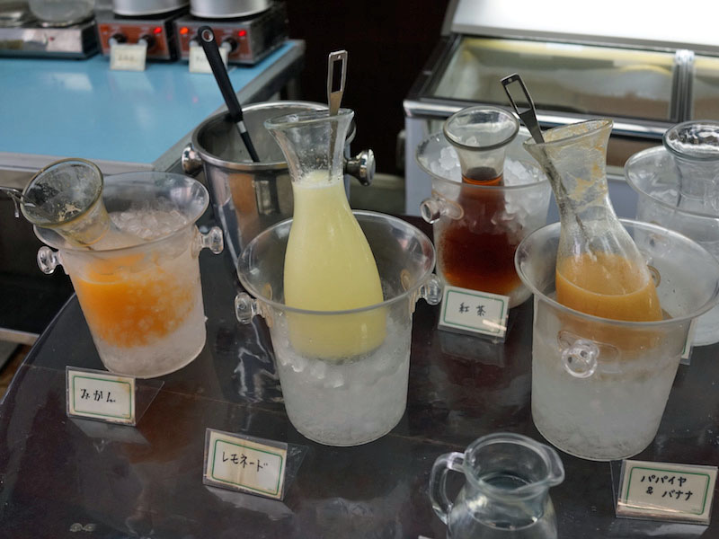 今日はみかんにレモネード、バナナとパパイヤのミックスジュースにアイスコーヒー、おいしいお水。