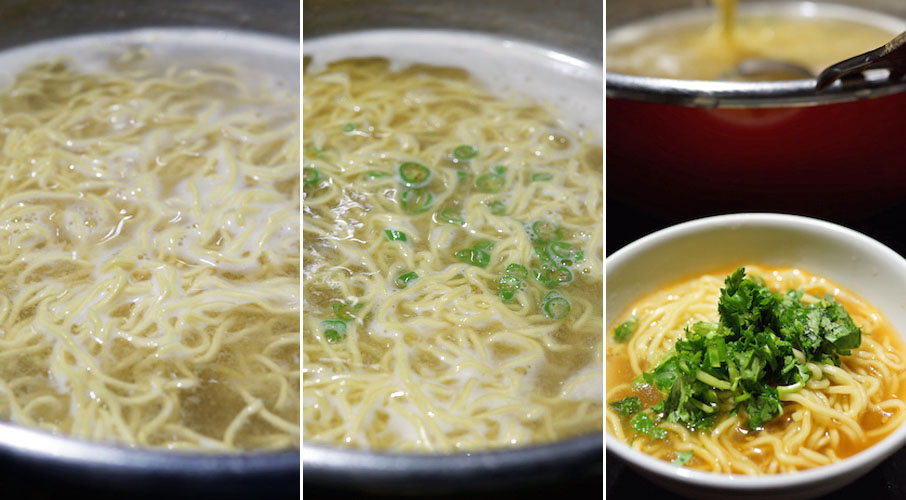 加水の少ない卵麺。細めで縮れて、粉にまみれた麺を入れ、鍋の温度をギリギリ揚げて、沸騰したらそこに青いとうがらし。