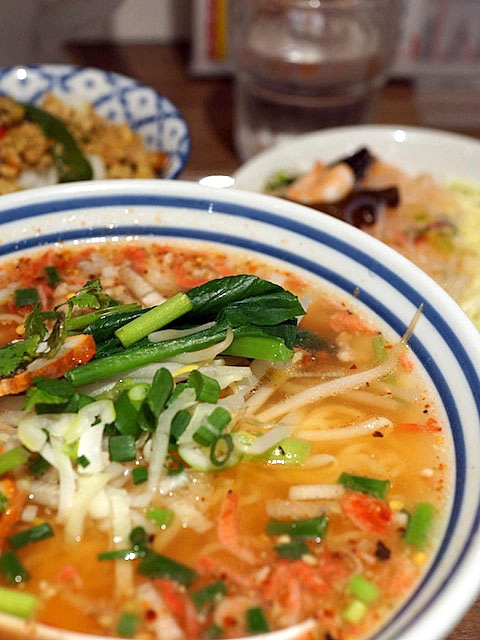 屋台風のトムヤンクン麺を中華風の卵麺で作ってもらう。