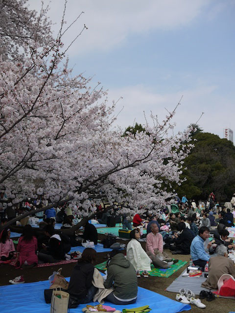中に入るとブルーシートを地面にはって、準備万端、花見に興ずる人で一杯。
