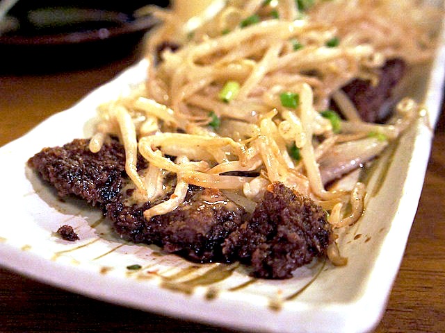 油でバリッと揚げたのに、ウスターソースをタップリかけて、そこにモヤシ炒めをのせる。