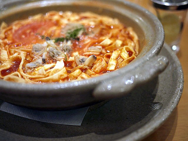 ポッテリとしたトマトスープをスプーンで口に運びつつ、ズルンと麺をすするとヌードルスープのようになり、トマトの酸味がスッキリ、口に広がっていく。