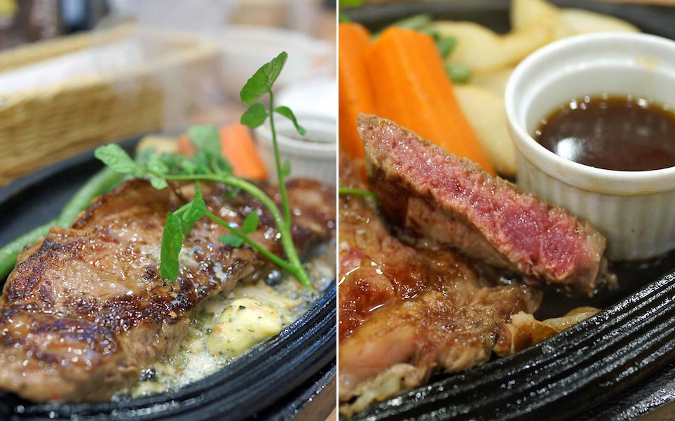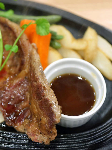 出汁の風味を感じる特製醤油ソースと、ハーブの香りが肉のおいしさ引き立てるメンテルバターでもりもり肉をたのしめる。
