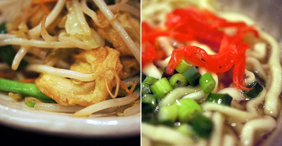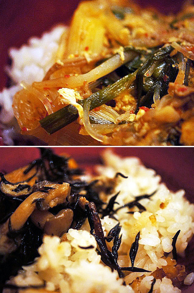 熱々、しかもコッテリ味の味噌の風味がおいしい汁で、それにサイドがお新香、海苔にしらすおろしという組み合わせ。