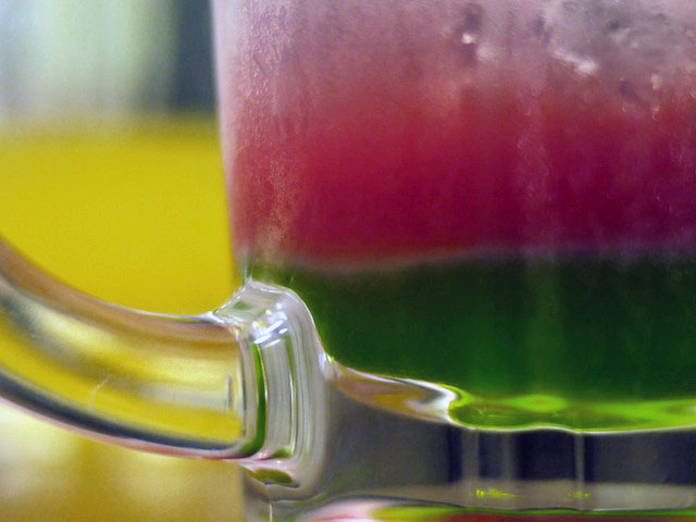 比重の違いでキレイなプースカフェ状態のカクテル風に出来上がる。