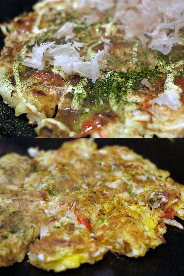 普通のお好み焼きにはソース、おかかに青のり、マヨネーズ。